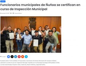 El medio comunal destacó que el pasado viernes 15 de noviembre, 41 funcionarias y funcionarios de diversas direcciones del municipio de Ñuñoa culminaron con éxito el curso de “Inspección Municipal” impartido por la Universidad Tecnológica Metropolitana (UTEM).